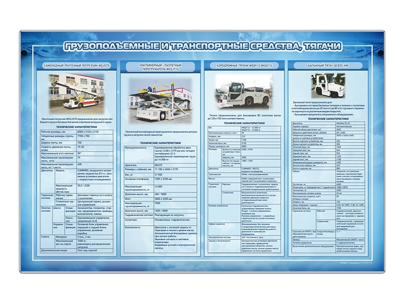Стенд "Технические средства аэродромного обслуживания летательных аппаратов. Грузоподъемные и транспортные средства, тягачи"
