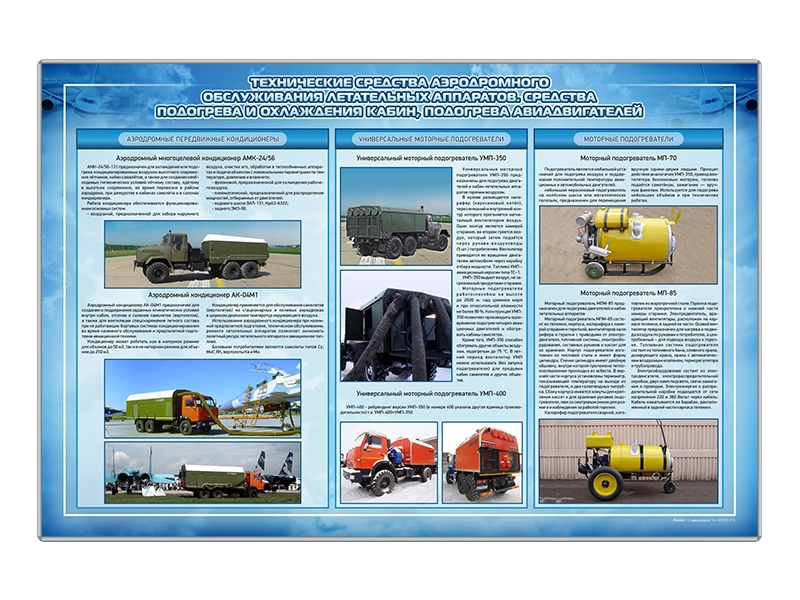 Стенд «Технические средства аэродромного обслуживания летательных аппаратов. Средства подогрева и охлаждения кабин, подогрева авиадвигателей» представляет собой информационную панель, на которой размещены краткие характеристики и иллюстрированный материал по следующим техническим средствам наземного обеспечения полетов, предназначенным для подогрева и охлаждения кабин, подогрева авиадвигателей: